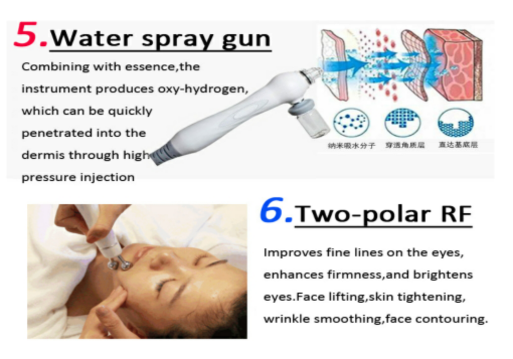 This is newest 6 in 1 facial skin care machine using h2 o2 generator make the purified water into hydrogen and skin ions water, the surface of the skin can produce H2 molecules. So that the water molecule cells can quickly penetrate the dermis. So as to achieve the effect of skin rejuvenation and whitening, give you a fresh face !