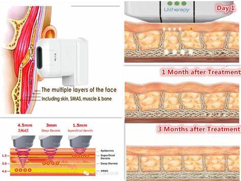 HIFU targets the deep down foundation layer of your skin, the same layer that is addressed in cosmetic surgery. Unlike lasers, which penetrate the skin from the outside to inside, the HIFU procedure bypasses the surface of the skin, and delivers targeted energy specifically into the deep, structural tissues and muscles where collagen thrives. HIFU involves penetrating ultra-sound energy to stimulate collagen production in the deep dermal and sub dermal levels, fascia and the SMAS layer which results in micro injury to that tissue. It results in a ‘selective thermal coagulative zone’ on the subcutaneous layer and SMAS layer improving the skin aging. As the tissue heals, it increases collagen and as the collagen fibres organise and shorten, a tightening effect is seen on the skin.